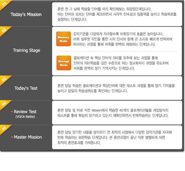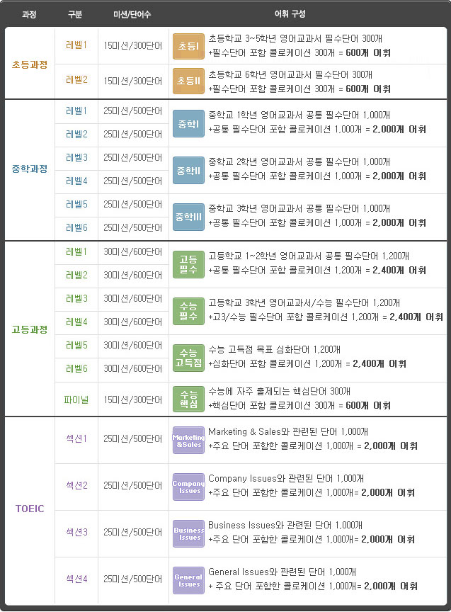 °¢ ·¹º§ ¹× ¼½¼ÇÀº 25/30°³ MissionÀ¸·Î ±¸¼º(´Ü, ÃÊµî ¹× °íµîÆÄÀ̳ÎÀº 15°³ Mission)µÇ¾î ÀÖÀ¸¸ç, 1°³ÀÇ MissionÀº 1ȸ ºÐ·®À¸·Î Çٽɴܾî 20°³ ¿Í ±× Çٽɴܾ Æ÷ÇÔÇÑ ÄÝ·ÎÄÉÀÌ¼Ç 20°³·Î ÃÑ 40°³ÀÇ ¾îÈÖ°¡ Æ÷ÇԵǾî ÀÖ½À´Ï´Ù. |